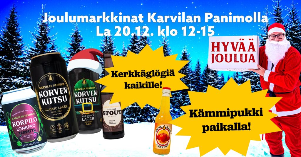 Tervetuloa perinteisille Karvilan Panimon Joulumarkkinoille lauantaina 20.12. klo 12:00-15:00. Tule tekemään raikkaita juomaostoksia joulun herkkujen pariksi. Tarjolla muun muassa sesongin lonkeroa, klassikko- sekä uutuusoluita, oheistuotteita, kuten uusia pipoja, saunamittareita, olutlaseja, pullonavaajia sekä kangaskasseja.