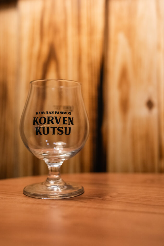 Korpikulho on tyylikäs ja jämäkkä valinta niin arkeen kuin juhlaan. Karvilan Panimon Korven Kutsu tyylittely löytyy lasin kyljestä.